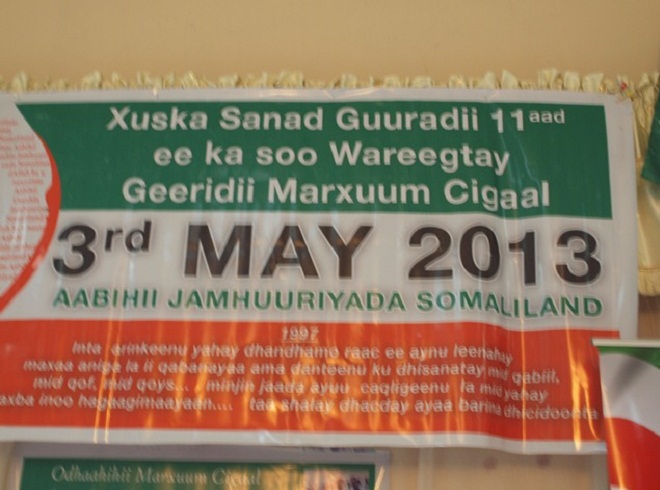 Sabti, May 04, 2013 (HOL) — Munaasibad lagu xusayey sanadguuradii 11aad ee ka soo wareegtay geeridii ALLE ha u naxariisktee Maxamed Xaaji Ibraahim Cigaal Madaxweynihii laabaad ee Somaliland, ayaa xalay lagu qabtay Hoteel Maansoor ee Magaalada Hargeysa, kaas oo ay ka soo qaybgalleen boqolaal dadweyne oo iskugu jira dhalinyarada iyo ardayda jaamacadaha.