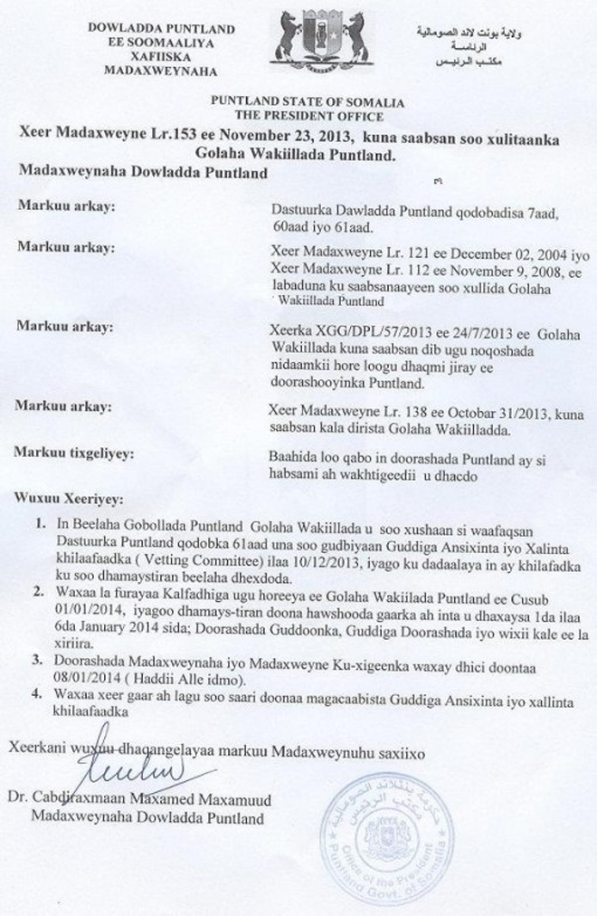 Hoos ka akhriso digreetadda ka soo baxay xafiiska madaxweynaha Puntland:
