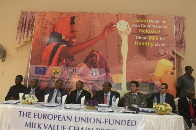 Talaado, November 26, 2013 (HOL) — Madaxweynaha Somaliland, Axmed Maxamed Maxamuud Siilaanyo ayaa ka qayb-galay mashruuc lagu horumarinayo caanaha xoolaha Somaliland oo ay ku baxayso afar milyan iyo afar boqol oo kun oo lacagta midowga Yurub ah.