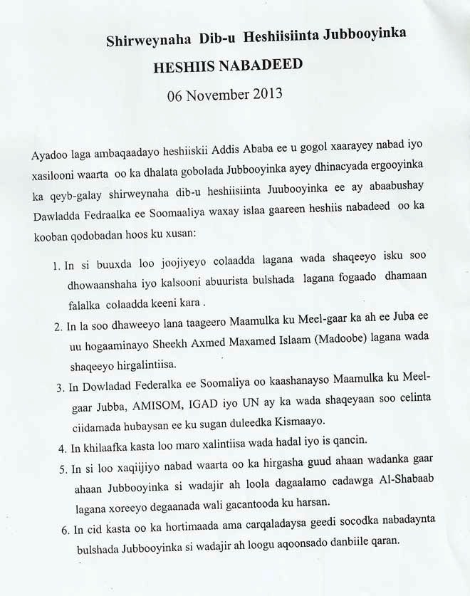 Arbaco, November 06, 2013 (HOL) — Shirkii dib u heshiisiinta Jubbooyinka oo ka socday Muqdisho saddexdii maalmood ee lasoo dhaafay ayaa maanta lasoo gabagabeeyay, inkastoo uu buuq ka dhashay lana xalliyay.