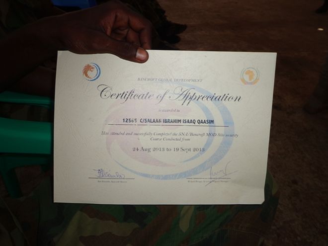Abaanduulaha ciidamada xoogga dalka, Jen. Cabdirisaaq Khaliif Cilmi oo ka qaybgalay xafladda tababarka loogu soo xirayay ciidamadan ayaa ku boorriyey in ay dhabar-adayg muujiyaan, isagoo uga mahadceliyay tababarkan hay'adda Bancroft oo tababarro siisay ciidamadan oo sugi doona ammaanka xarunta wasaaradda gaashaandhigga Soomaaliya.