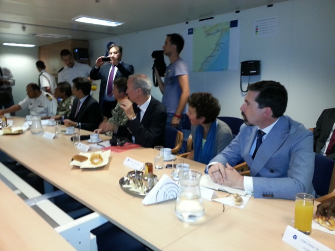 Waa markii ugu horreysay oo madaxweynaha Soomaaliya iyo wafdi la socda ay kulan kaga qayb galaan markab dagaal oo Midowga Yurub laga leeyahay korkiis, iyadoo tani ay macno weyn u sameynayso dowladda Soomaaliya sida kulanka lagu qabtay markabka dushiisa laga sheegay.