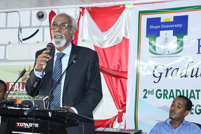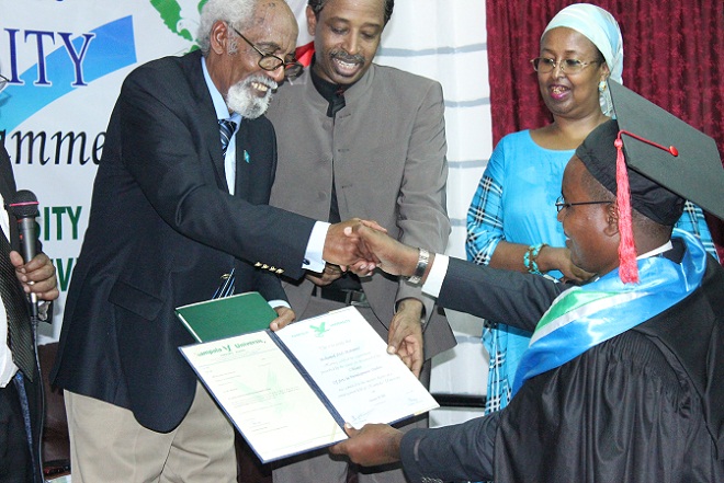 Isniin, Maarso 11, 2013 (HOL) — Jaamacadda Hope ayaa maanta 19-arday guddoonsiisay shahaadada Master-ka ah, kuwaasoo sagaal ka mid ah ay ku suganayeen magaaladaMuqdisho, halka 10-ka kalena ay joogeen magaalada Hargeysa ee xarunta Somaliland, iyadoo munaasabaddii Muqdisho ay kasoo qaybgaleen mas’uuliyiin uu ka mid ahaa guddoomiyaha baarlamaanka Soomaaliya, Prof. Maxamed Cismaan Jawaari.