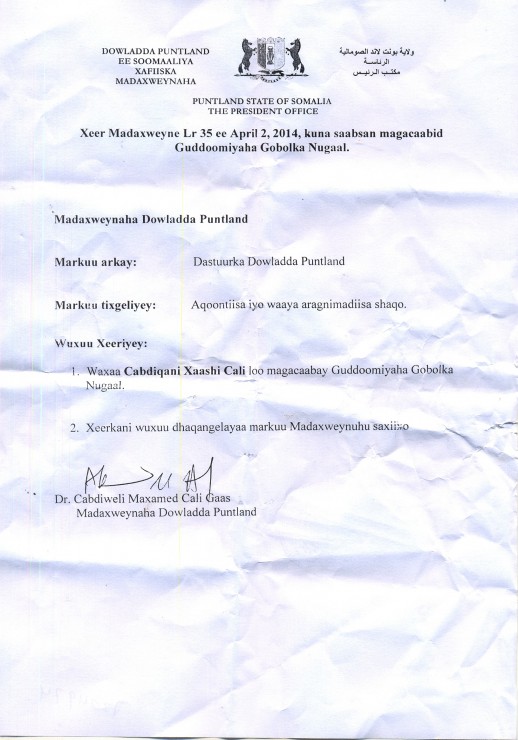 Guddoomiyihii hore ee gobolka Nugaal, Cabdi Xirsi Cali QarjabKhamiis, Abriil 03, 2014 (HOL) —Wareegto kasoo baxday xafiiska Madaxweynaha Puntland C/weli Maxamed Cali Gaas ayaa guddoomiye cusub loogu magacaabay gobolka Nugaal.