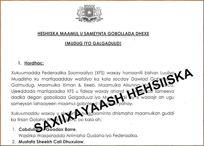 Wasiirka arrimaha gudaha iyo federaalka, Cabdullaahi Goodax Barre ayaa akhriyay qodobbada oo ka koobanaa 11 oo lagu wajahayo dhismaha maamul loo dhan yahay oo yeeshaan gobollada dhexe ee Somalia, isagoo sheegay in heshiiskan uu dhabbaha u xaarayo xal laga gaaro maamullada yar-yar ee ka jira gobollada dhexe, loogana gudbayo maamul goboleed ay ku midaysan yihiin dadka deegaannadaas ku nool. Iyadoo intaas kaddib ay heshiiskaan saxiixeen wakiillo matalayay Galmudug, Ahlusunna, wasiiro xukuumadda ka tirsan iyo xubnaha ka socday beesha caalamka.