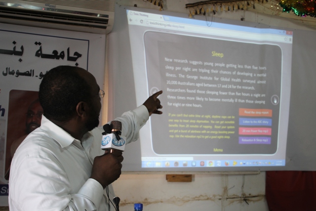 Isniin, June 09, 2014 (HOL) — Ardayda Jaamacadda Banaadir ayaa loo qabtay tababar ku saabsan caafimaadka cudurada ku dhaca dhimirka ama maskaxda ee loo yaqaanno (Mental Health), waxaana casharradan bixinayay Dr. C/casiis Muuse Maaxaay oo ah samafale iyo aqoonyahan dhinaca caafimaadka ah.