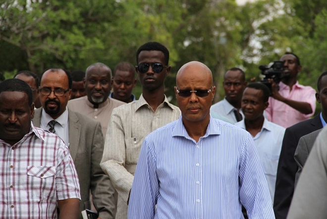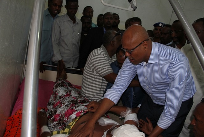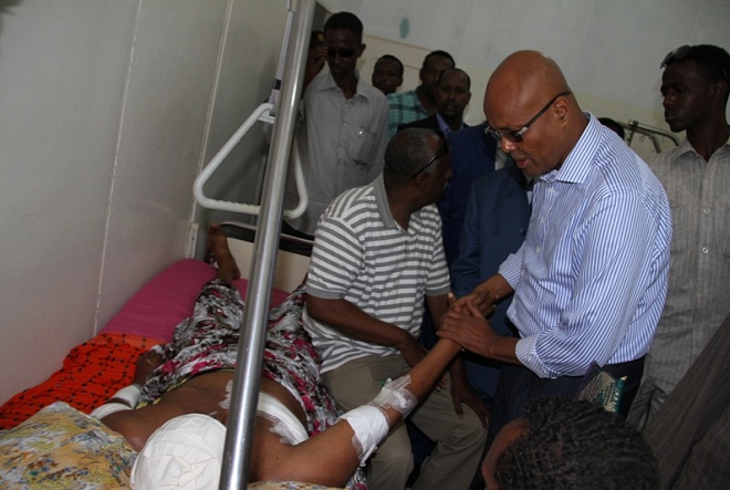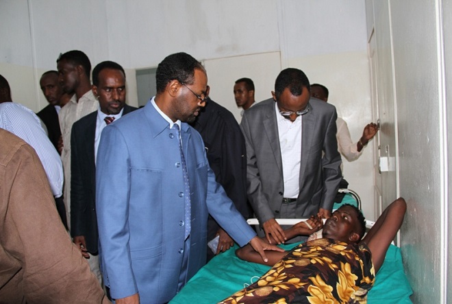 Axad, May 25, 2014 (HOL) — Ra'iisul wasaare, C/wali Sheekh Axmed iyo qaar ka mid ah golihiisa wasiirrada ayaa maanta booqday isbitaal Madiina oo ay ku jiraan qaar ka mid ah dhaawacyada dadkii ku waxyeelloobay weerarkii ay Al-shabaab ku qaadday shalay oo Sabti ahayd xarunta baarlamaanka Soomaaliya.