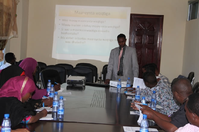 Isniin, November 24, 2014 (HOL) — Waaxda shaqada, shaqaalaha iyo tababarrada ee xafiiska Ra’iisul wasaaraha Somalia ayaa tababar soconayay maalin kuna saabsan kor u qaadidda aqoonta xirfadlayaasha u qabatay qaar ka mid ah shaqaalaha xafiiska, kaasoo qeyb ka ah barnaamijka tayeynta iyo tababarrada shaqada iyo shaqaalaha XRW ee uu ku dhawaaqay xoghayaha joogtada ah ee xafiiska ra’iisul wasaaraha, C/qaadir Cabdi Faarax.