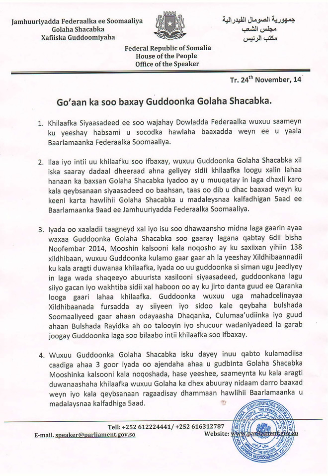 Isniin, November 24, 2014 (HOL) — Guddoonka golaha shacabka ayaa manta go'aanno ka soo saaray khilaafka taagan, isgaoo xusay inuu khilaafka madaxda dalka saameyn xooggan ku yeeshay hay'adaha dowladda oo dhan.