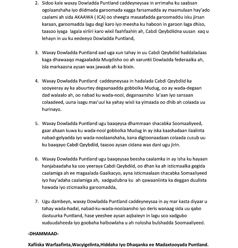 War-saxaafadeed kasoo baxay madaxtooyada ayaa lagu faah faahiyey ujeedada shirka iyo weliba qodobadii kasoo baxay, waxaana war-saxaafadeedkaas oo nuqul kamid ahi uu Hiiraan Online soo gaaray ugu horreyn lagu beeniyey hadalkii Madaxweynaha Galmudug ee ahaa in loo diidey garoonka Gaalkacayo inuu kasoo dego.