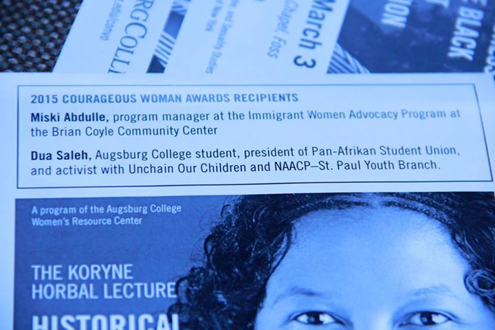 Khamiis, Maarso 05, 2015 (HOL) — Xarunta howlaha Dumarka ee Augsburg Collage ayaa guddoonsiisay shahaado sharaf iyo aqoonsi geesinimo, Miski Cabdulle oo ah hooyo Soomaaliyeed oo wax badan u soo qabatay Jaaliyadda Soomaliyeed iyo dad kale oo jinsiyado kala duwan leh oo ku nool Minnesota.