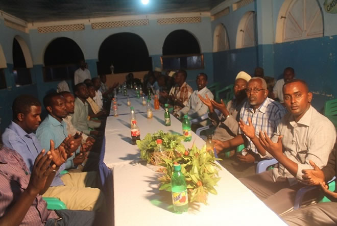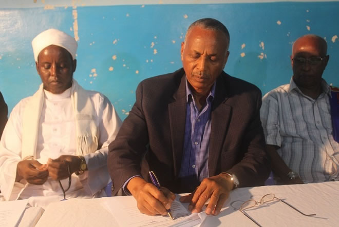 Madasha heshiiskan lagu saxiixay ayaa waaxa goob-joog ka ahaa odayaasha deegaanka, ganacsato iyo qaybaha bulshada rayidka ah, waxana qodobbada heshiiska ee dhinacyadan u kala saxiixay wasiirka gaashaandhigga Somalia Jen. C/qaadir Sh. Cali Diini iyo wakiilka golaha fulinta ee Ahlusunna Wal-jamaca, Sheekh Maxamed Shaakir.
