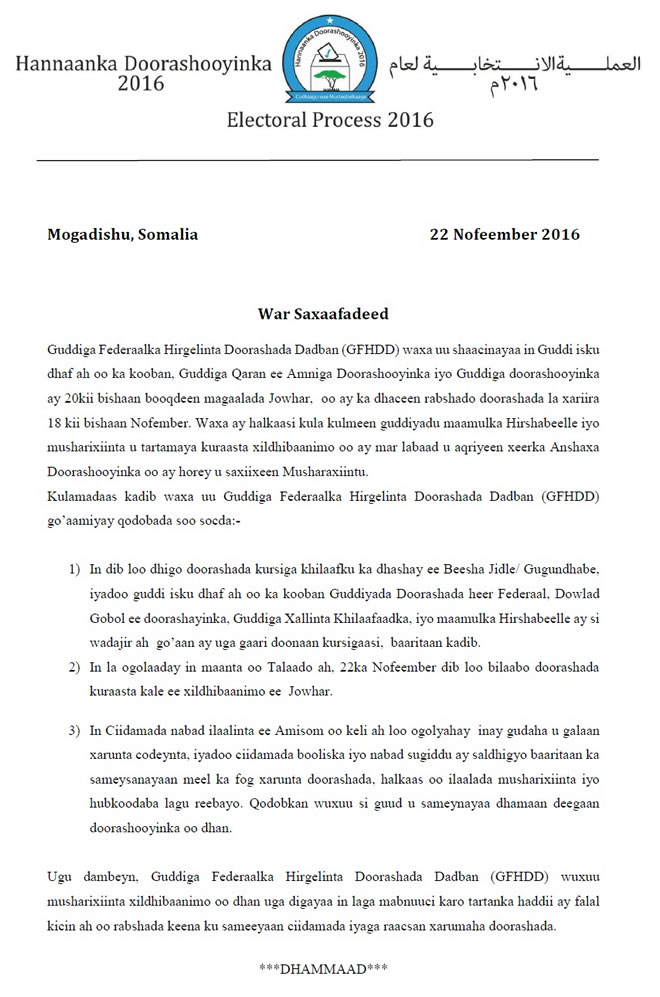 Arbaco, November 23, 2016 (HOL) — Guddiga Hir-gelinta Doorashada ee Heer Federaal, ayaa War-saxaafadeed uu soo saaray kaga hadlay khilaaf ka dhashay kursi ka mid ah kuwa Aqalka Hoose ee Doorashada Hir-shabeelle, kaasoo dhaliiyay gacan ka hadal.