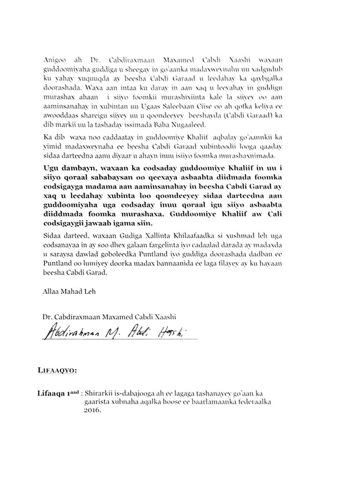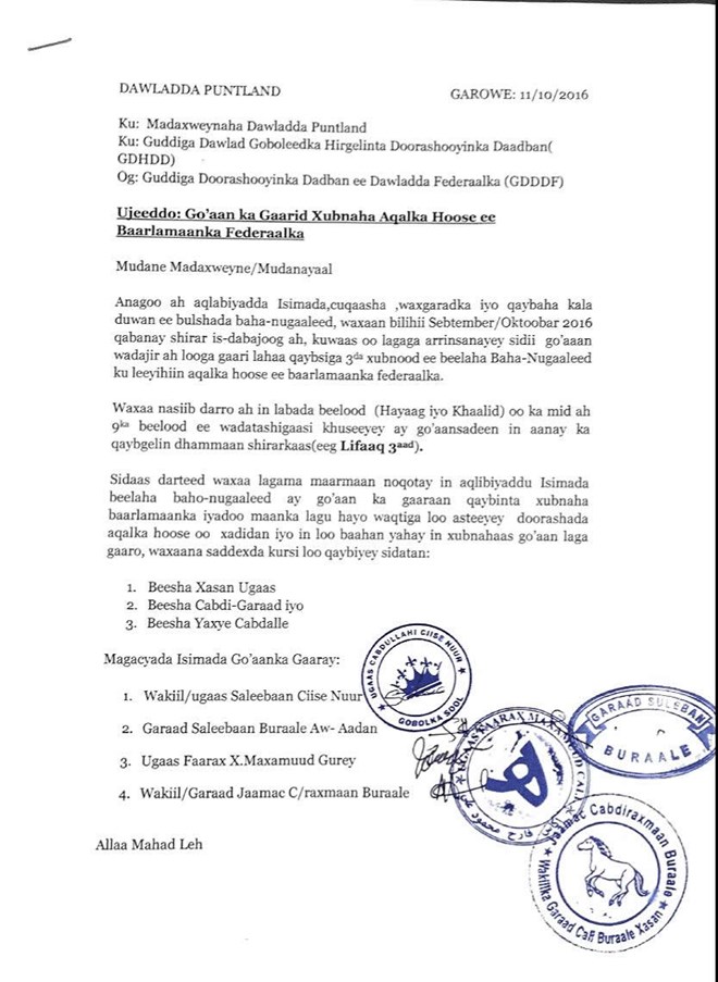"Waxaan guddiga sharafta leh ee xallinta khilaafaadka u soo gudbinayaa caddaalad darro iyo is-hortaag lagu sameeyey hannaankii iyo waxqaybsigii ay ku heshiiyeen Beelaha Baha-Nugaaleed ee Dhulbahante xubnaha baarlamaanka ee aqalka hoose ee baarlamaanka federaalka kuwaas oo buuxiyey tallaabooyinkii loo dajiyey habraaca doorashada ee khuseeya xulidda xildhibaanada aqalka hoose 2016". Qoraalkii ayaa sidaa lagu xusay.
