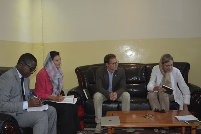 Talaado, Augusto, 15, 2017 (HOL) –Wasiirka Arrimaha dastuurka ee Xukuumaadda Federaalka Soomaaliya Cabdiraxmaan Xoosh Jibriil ayaa xafiiskiisa ku qaabilay Danjiradda Midowga Yurub (EU) u fadhisa Soomaaliya Veronique Lorenzo iyo masuuliyiin kale oo ka socotay Xafiiska EU ee Soomaaliya, Wasiirka waxaa kulanka ku wehliyay Agaasimaha Guud ee Wasaaradda Mudane Maxamed Abuukar Zubeyr.