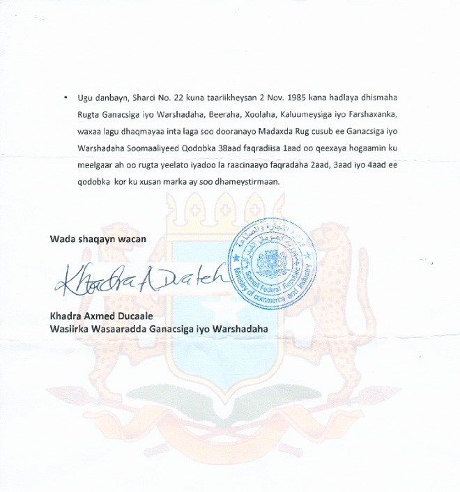 Wasaarada ayaa sheegtay in iyada oo lagu dhaqmayo xeerka ganacsiga ee 1985tii la isugu yeero dhamaan rugaha ganacsiga Soomaaliyeed.