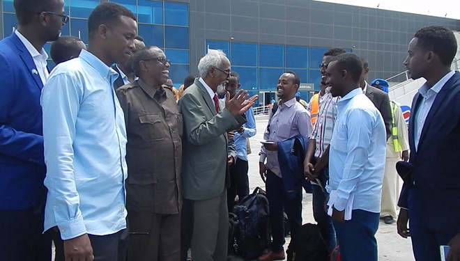 Isniin, Augusto, 07, 2017 (HOL) –Guddoomiyaha Baarlamaanka ee dowladda Soomaaliya Pro Maxamed Sheekh Cismaan Jawaari, ayaa maanta garoonka diyaaradaha ee magaalladda Muqdishu ku sogootiyay in ka badan 45 arday oo deeq waxbarasho ka helay dowladdaha Kenya iyo Uganda.
