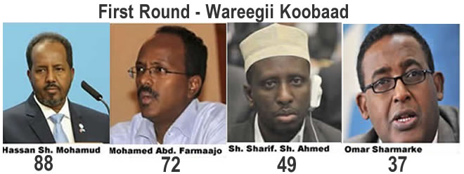 Waxaa u gudbay wareega labaad ilaa afar musharax oo kala ah Xassan Shekh Max'uud oo halay 88 cod, Max'ed C/llaahi Farmaajo oo helay 72 cod, Shariif Sheekh Axmed oo helay 49 cod iyo Cumar C/rashiid Cali Sharma'arke oo isaga haley 37 cod.