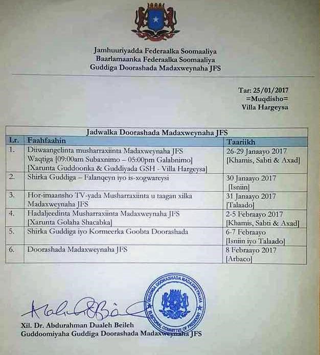 Arbaco, Janaayo, 25, 2017 (HOL) – Guddiga doorashada madaxweynaha Soomaaliya oo maalintii shalay lagu dhawaaqay ayaa isla maanta shaaciyay jadwalka doorashada madaxweynaha Soomaaliya, kadib kulan ay ku yeesheen magaalada Muqdisho.
