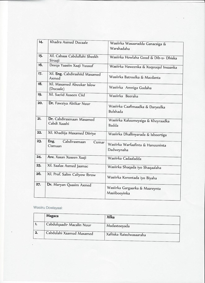 Talaado, Maarso, 21, 2017 (HOL) – Ra’iisal wasaaraha Soomaaliya Xassan Cali Kheyre ayaa goor dhaw oo maanta ah ku dhawaaqay xubnaha gollaha wasiirada xukuumada cusub ee Soomaaliya oo ka kooban 26 wasiir, 26 wasiir ku-xigeen,15 wasiiru-dowle iyo hal ra’iisal wasaare ku-xigeen.