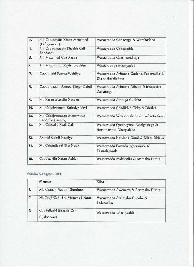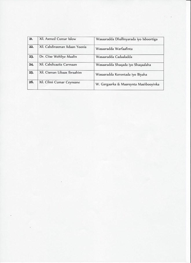 Akhriso liiska xubnaha gollaha wasiirada oo dhameystiran :