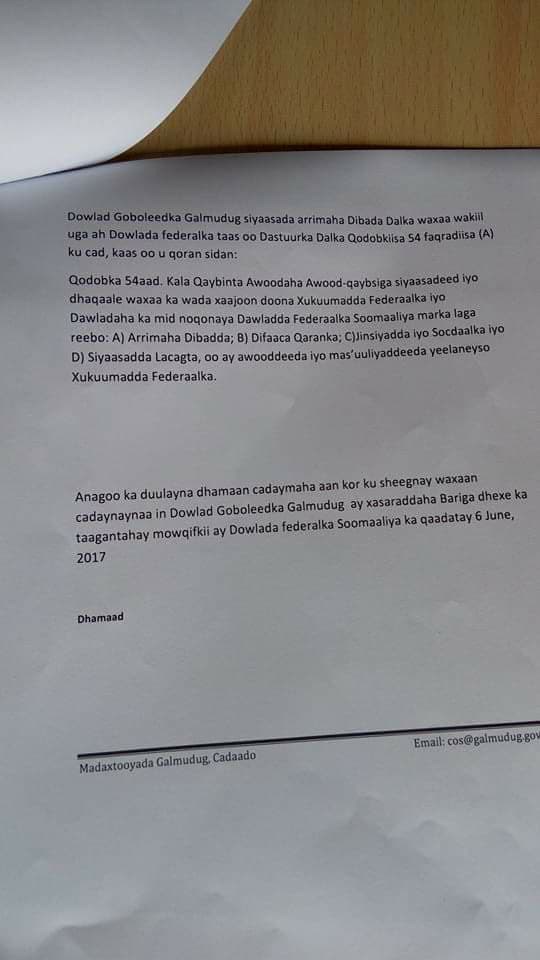 Hadaba Hoos ka Akhriso qoraaalka danbe ee ka soo baxay Galmudug :