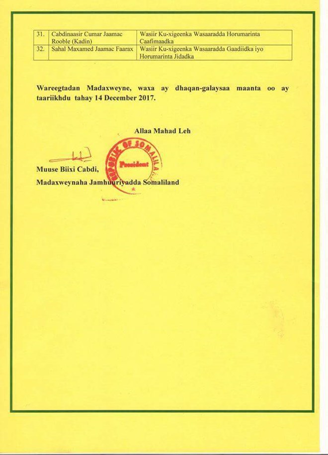 Khamiis, December, 14, 2017 (HOL) – Madaxweynaha cusub ee Somaliland Muuse Biixi Cabdi ayaa ku dhawaaqay xubnihiisa golaha wasiiradda maalin kaddib markii loo dhaariyay xilka madaxweynaha munaasabad shalay ka dhacday xarunta madaxtooyada.