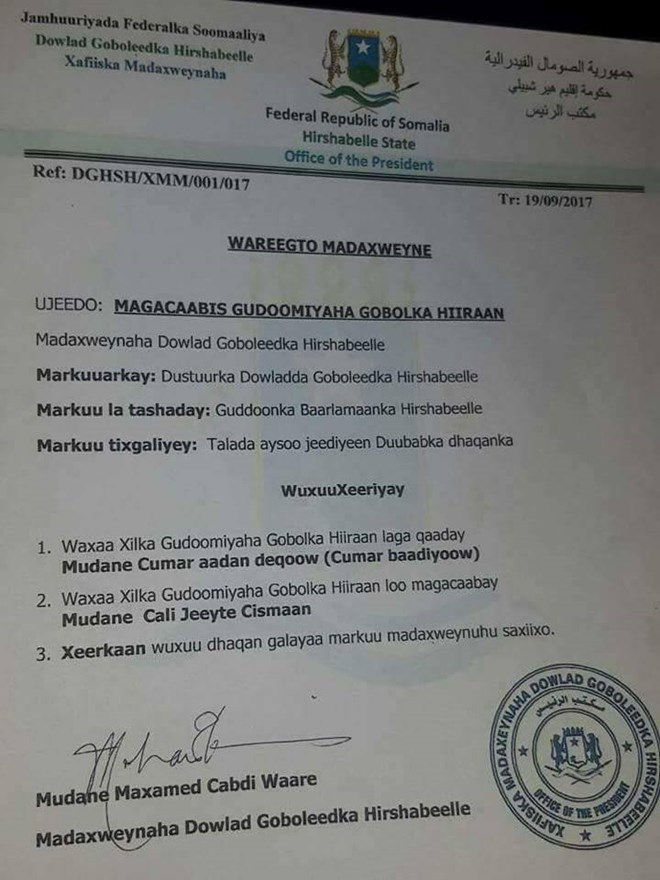 Arbaco, September, 20, 2017 (HOL) – Madaxweynaha cusub ee maamulka Hirshabeelle Maxamed Cabdi Waare ayaa wareegto uu soo saaray xilkii uga qaaday guddoomiyihii gobolka Hiiraan Cumar Aadan Ibraahim Baadiyoow isaga oo xilkan u magacaabay Cali Jeyte Cismaan.