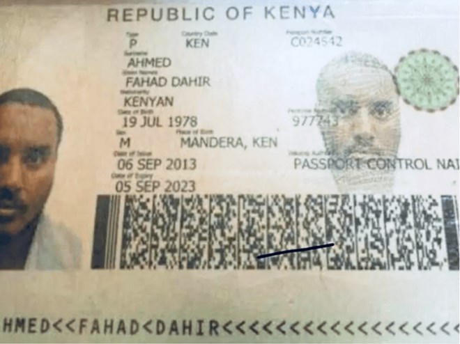 Fahad Yaasiin ayaa heysta baasaboor Kenyan ah oo nambarkiisa yahay C024542 iyo sidoo kale kaarka aqoonsi muwaadinimada oo nambarkiisa 28847167, soo raad raac u noqonay baaritaanka socda.