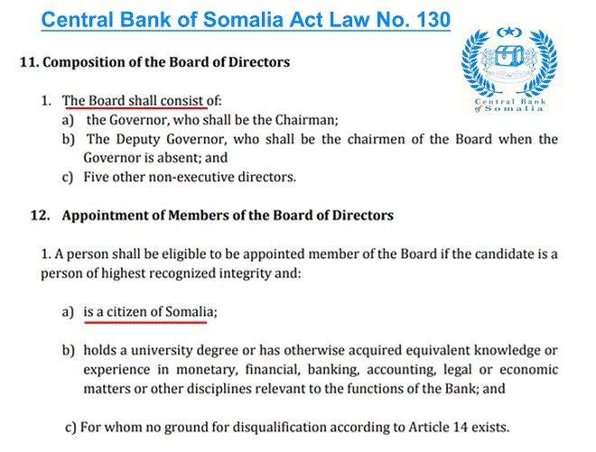 Laakiin haddana dhinaca kale marka la eego hadalka ka soo yeeray Wasiirka ayaa u muuqda mid baal-marsan dastuurka dalka oo qodobkiisa 12aad uu dhigayo in xilka gudoonka Bankiga dhexe uu qaban karo oo kaliya qof Soomaali ah.