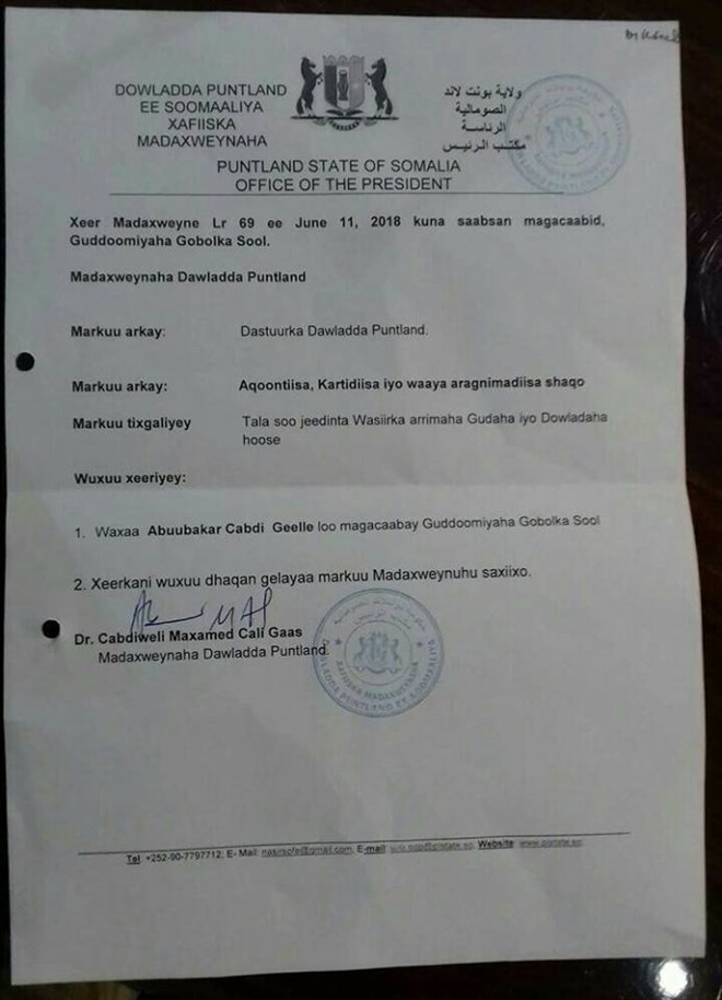 Qoraal ka soo baxay xafiiska madaxweyne Gaas ayaa lagu magacaabay Abuukar Cabdi Geelle oo noqonaya guddoomiyaha gobolka Sool ee maamul gobolleedka Puntland.