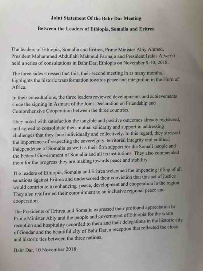 Sabti, November, 10, 2018 (HOL)-Waxaa magaalada Bahar Dar ee dalka Itoobiya ku soo dhamaaday shir ay halkaa ku lahaayeen hoggaamiyayaasha saddexda dal ee Soomaaliya, Eritrea iyo Itoobiya.
