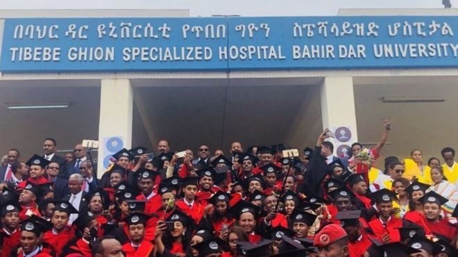 Sabti, November, 10, 2018 (HOL) – 172 dhakhaatiir caafimaad ayaa Jaamacadda Baahir Dar ee dalka Itoobiya ka qelinjebiyey munaasabadda qelin jebinta oo ay ka qaybgaleen R'isalwasaaraha Itoobiya Dr Abiy Axmed, Madaxweynaha Soomaaliya Maxammed Cabdullaahi Farmaajo iyo Madaxweynaha Eretrea Isaayaas Afwarqi.