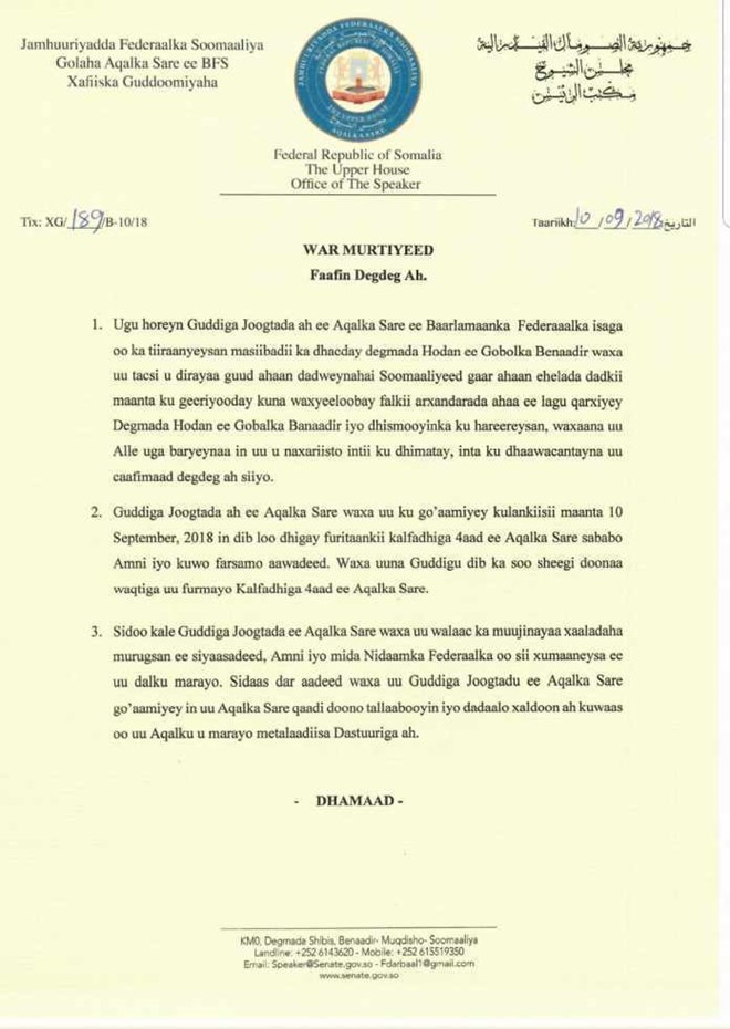 Golaha Aqalka sare ayaa sidoo kale sheegay in uu sababo dhinaca amniga ah dib loogu dhigay furitaanka Kalfadhiga Golaha, islamarkaana waqtiga rasmiga ah ay dib ka soo sheegi doonaan.