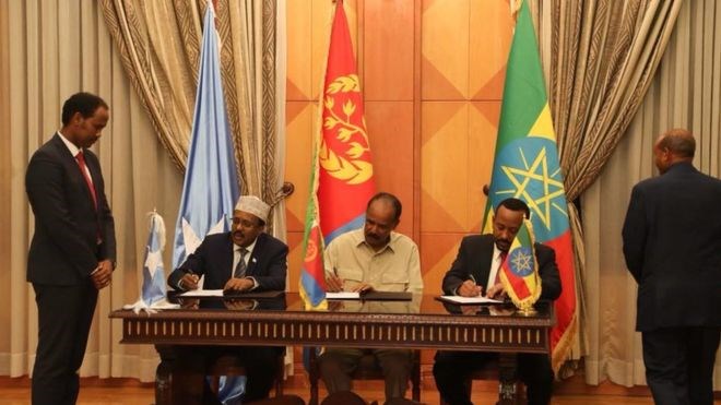Khamiis, September, 06, 2018 (HOL) -Dalalka Soomaaliya Itoobiya iyo Eritrea ayaa heshiis ku kala sixiixday magaalada Asmara ee caasimadda dalka Eritrea.