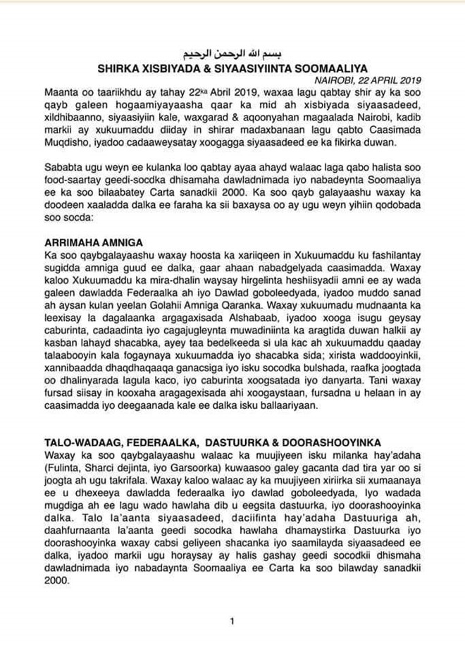 Isniin, April, 22, 2019 (HOL) – Waxaa magaalada Nairobi ee dalka Kenya ku soo dhamaaday shir ay halkaa ku lahaayeen siyaasiyiin iyo qaar ka mid xisbiyada mucaaradka dalka.