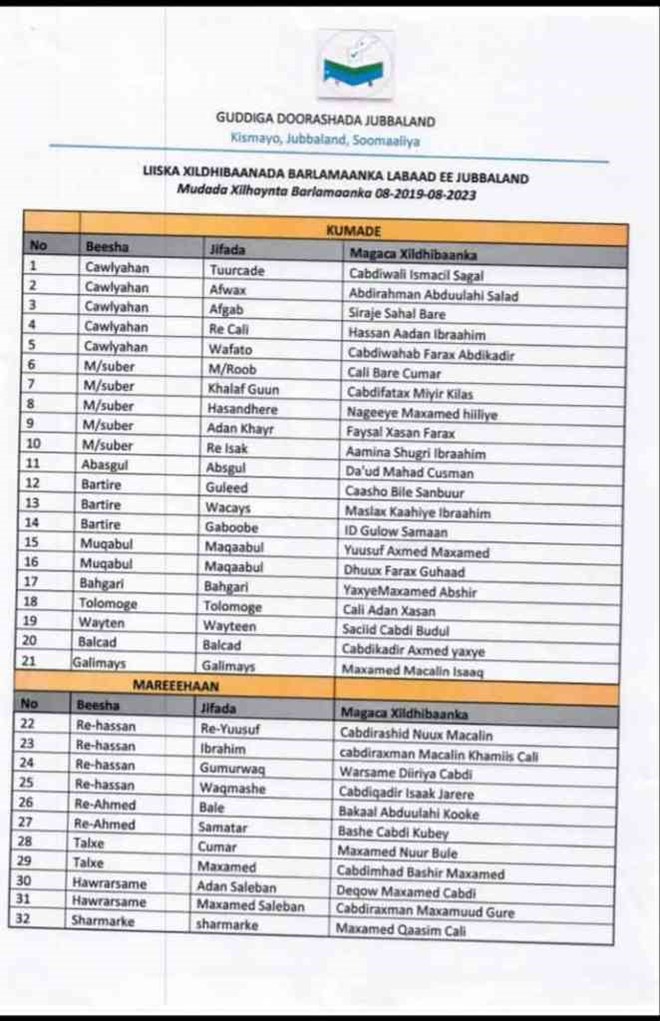 Talaado, Augusto, 13, 2019 (HOL) –Guddi doorasho oo ay magacaabeen musharixiinta xilka madaxweynaha Jubbaland ee isbadal doonka ayaa soo saaray liiska xildhibaanno ay ku sheegeen in ay soo xuleen odayaasha dhaqanka.