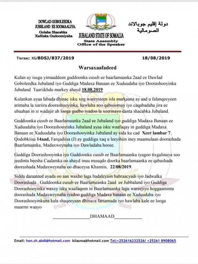 Isniin, Augusto, 19, 2019 (HOL)-Guddiga Doorashada madaxweynaha Jubbaland ayaa ugu danbeyntii ku wareejiyay guddoonka cusub Baarlamaanka inta dhisman hannaanka doorashada ee madaxweynaha Jubbaland.