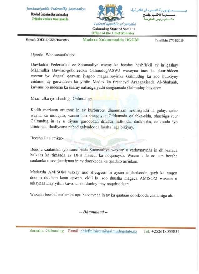 newsinsideQoraalka ayaa sidoo kale lagu sheegay in dowladda Soomaaliya burburisay dhamaanba heshiisyadii horey looga galay, taa badalkeeda deegaannada Galmudug ka soo buuxisay ciidamo iyo saanad militari, oo ay horkacayaan sida qoraalka lagu sheegay madax ka tirsan Ururka Al-shabaab.