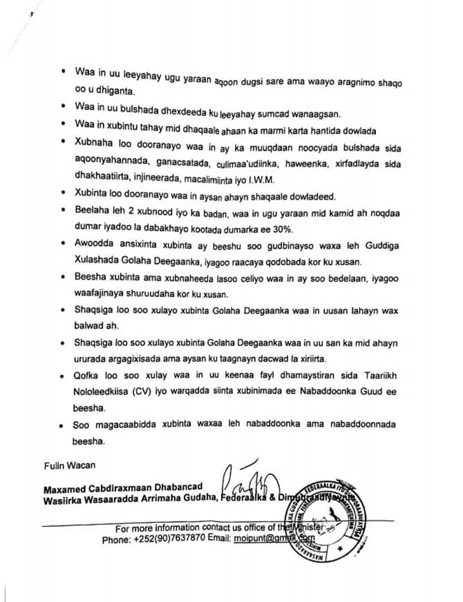 newsinsideWarqad uu ku saxiixnaa wasiirka arrimaha gudaha oo lagu soo bandhigay shuruudaha ayaa ku soo aadday xilli ay Puntland ka socoto dhismaha golayaasha deegaanka ee degmooyinka.