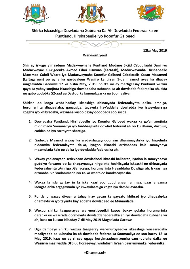 Axad, May, 12, 2019 (HOL) – Shir saddex-geesood ah ayaa maanta uga furmay magaalada Garoowe maamul-gobolleedyada Puntland, Hirshabeelle iyo Koonfurgalbeed,iyadoo inta badan shirka diirrada lagu saarayo iskaashi ay yeeshaan maamullada.