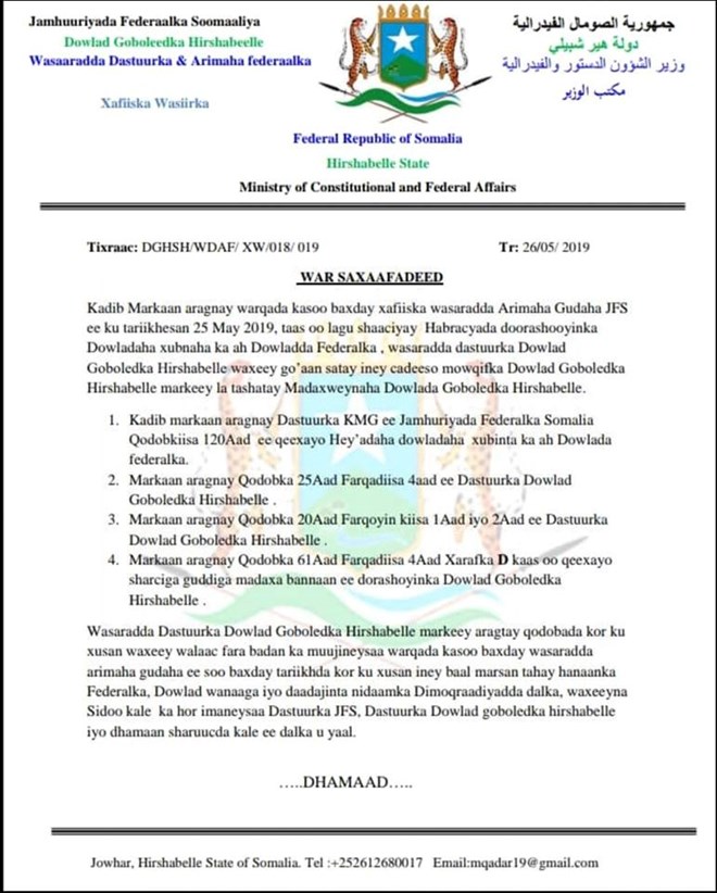 War-Saxaafadeed kasoo baxay Wasaaradda Arrimaha Dastuurka Maamulka Hir-Shabeelle ayaa walaac looga muujiyay Go’aanka Wasaaradda Arrimaha gudaha,waxaana lagu sheegay in habraacaas uu yahay mid baalmarsan nidaamka federaalka iyo midka dimuqraadiyada.