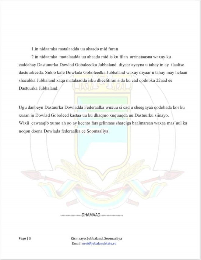Halkan ka aqriso qoraalka ka soo baxay Maamulka Jubbaland :