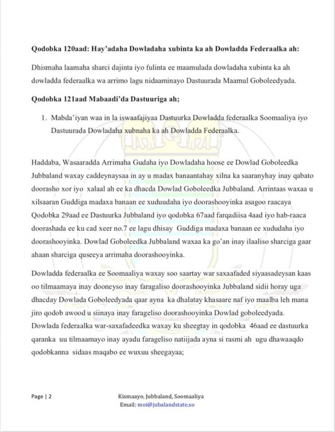 newsinside War Saxaafadeed ka soo baxay Maamulka Jubba ayaa lagu sheegay in qoraalkaas uusan waafaqsanayn dastuurka sidaa awgeedna ay xaq u leedahay maamulka Jubba inuu qabto doorasho xor ah.