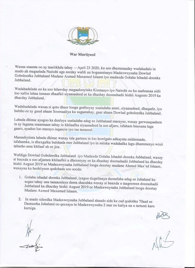 Khamiis, Abril 23, 2020 (HOL) - Madaxweynaha dowlad goboleedka Jubbaland Axmed Madoobe ayaa heshiis buuxa la gaaray golaha isbahaysiga isbedeldoonka Jubbaland oo ay ku midaysan yihiin murashixiinta ka hor yimid doorashadii sanadkii hore lagu doortay.