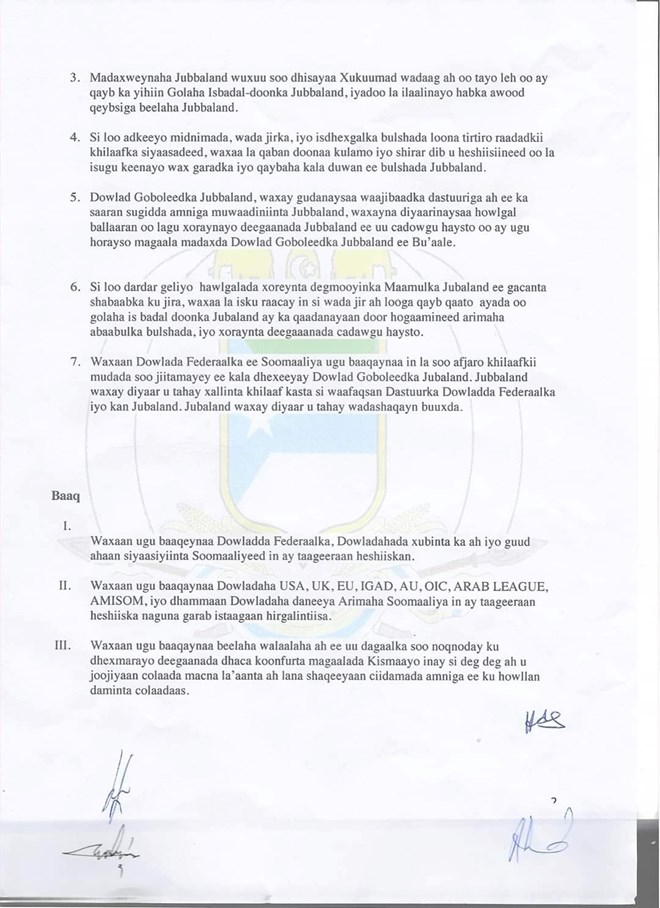 newsinsideHeshiiiska la gaaray, waxaa kamid ah, in madaxweyne Axmed Madoobe uu soo dhiso xukuumad ah wadaag ah oo ay qeyb ka yihiin golaha isbedeldoonka iyo in uusan doorashada dambe usoo tartami karin sida uu dhigayo dastuurka Jubbaland.