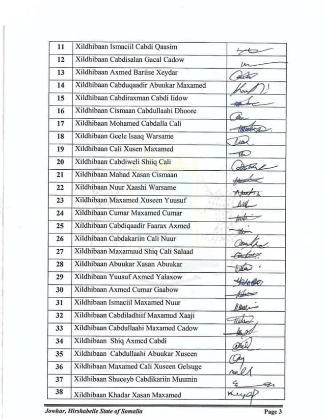 Sabti, Abril 25, 2020 (HOL) - Mudanayaal ka tirsan Baarlamanka Maamulka Hirshabeelle oo gaaraya 66 mudane ayaa waxey warqad u qoreen inuu ka jawaabo Guddoomiyaha Baarlamanka Hirshabeelle Cismaan Barre Maxamed , waxeyna ka codsadeen inuu ka warceliyo eedo ay usoo jeediyeen.