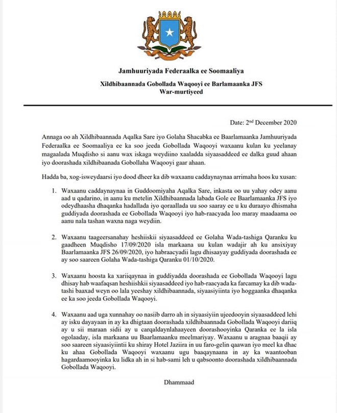 Arbaco, December, 02, 2020 (HOL) - 47 Xildhibaan oo ka kala tirsan barlamaanka labadiisa aqal kana soo jeeda gobolada waqooyi, ayaa sheegay guddoomiyaha aqalka sare in aanu ku mutalin mowqifkiisa diidmo ee Guddiyada doorashooyinka dadban.