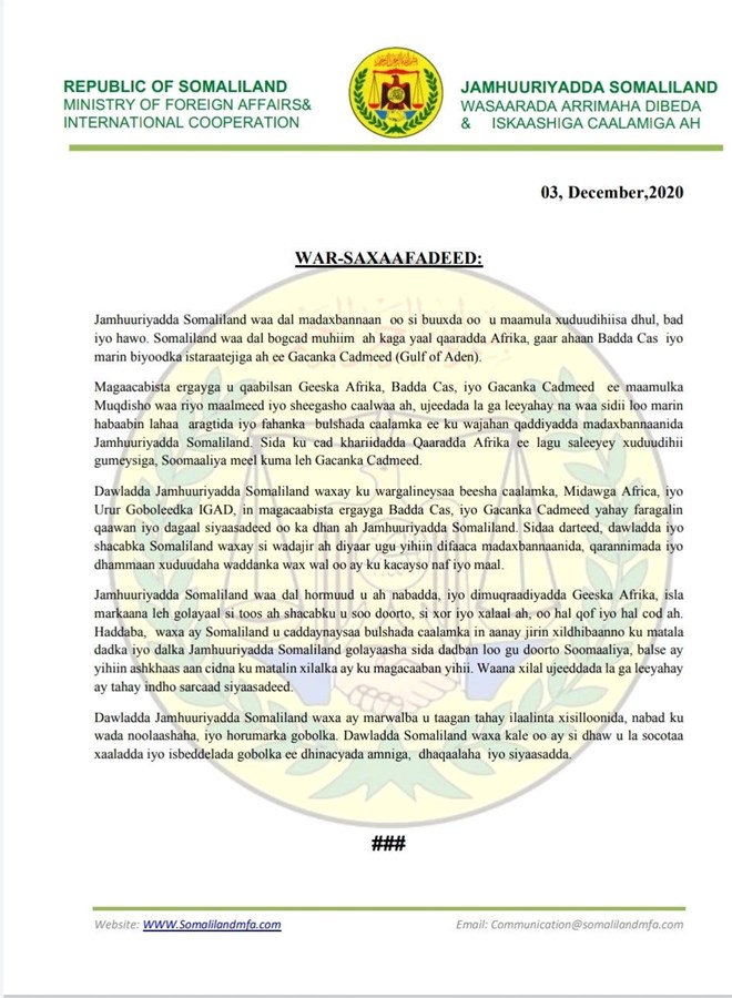“Magaacabista Ergayga u qaabilsan Geeska Afrika, Badda Cas, iyo Gacanka Cadmeed ee maamulka Muqdisho waa riyo maalmeed iyo sheegasho caalwaa ah, ujeedada la ga leeyahay na waa sidii loo marin habaabin lahaa aragtida iyo fahanka bulshada caalamka ee ku wajahan qaddiyadda madaxbannaanida Jamhuuriyadda Somaliland” ayaa lagu yiri qoraalkaasi.