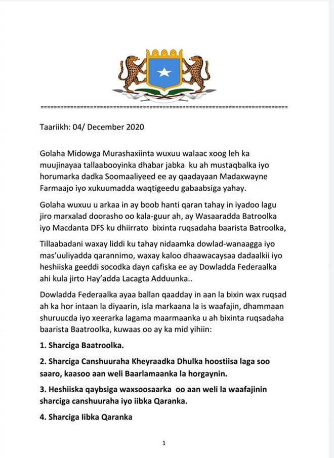 Sabti, December, 05, 2020 (HOL) - Golaha Midowga Musharaxiinta ayaa warsaxaafadeed ay soo saareen waxay walaac kaga muujiyeen Wasaaradda Batroolka iyo Macdanta oo ay ku eedeeyeen inay ku howlan tahay bixinta ruqsadaha baarista Shidaalka, xilli lagu jiro marxalad doorasho.